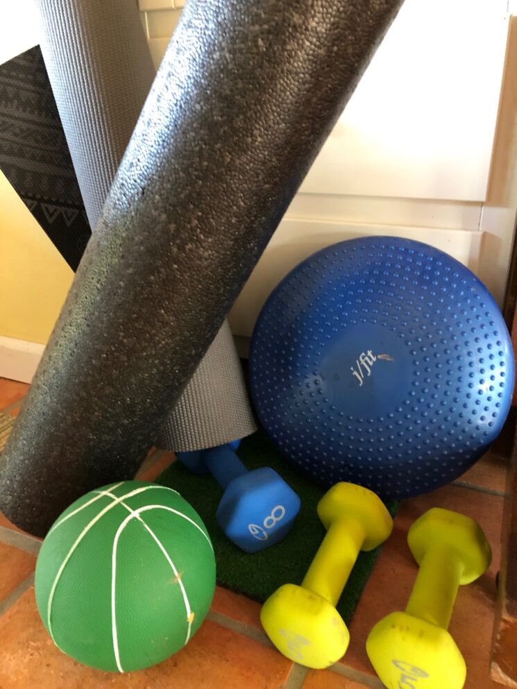Last week, I decided that I need to lift weights again. Although I would like to lift heavier weights, I don’t feel comfortable going to a gym right now with the pandemic, so I stationed my tiny bit of workout gear on our kitchen floor. It’s not the perfect place, but they are visable, and accessible, which in my case, makes working out, much more likely. It’s hard to ignore the pile when they stare at me while I’m standing at the kitchen island making breakfast, lunch and dinner each day.