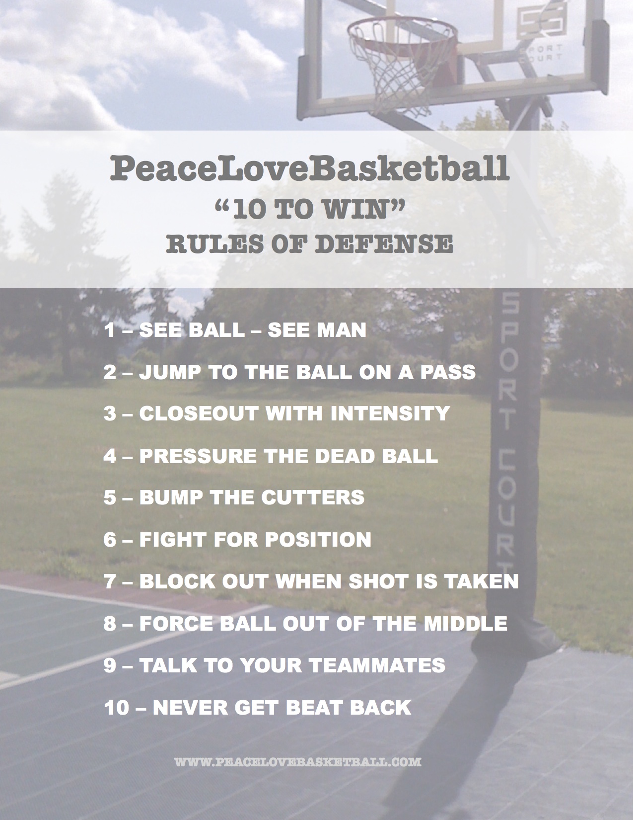 I hope this information was a good refresher for players and coaches and please feel free to download the PeaceLoveBasketball 10 to Win Rules of Defense and plaster it all over your house, your room, your bathroom mirror or your locker room, as a reminder of how to be your best on defense. Or simply take bits and pieces from the list to make it your own. And then the next time you’re on the court, remember to push yourself, and your teammates (or if you’re a coach, your players) and find a way to get excited about defense, because, like the old saying goes, “Offense sells the tickets, but DEFENSE wins the games.”